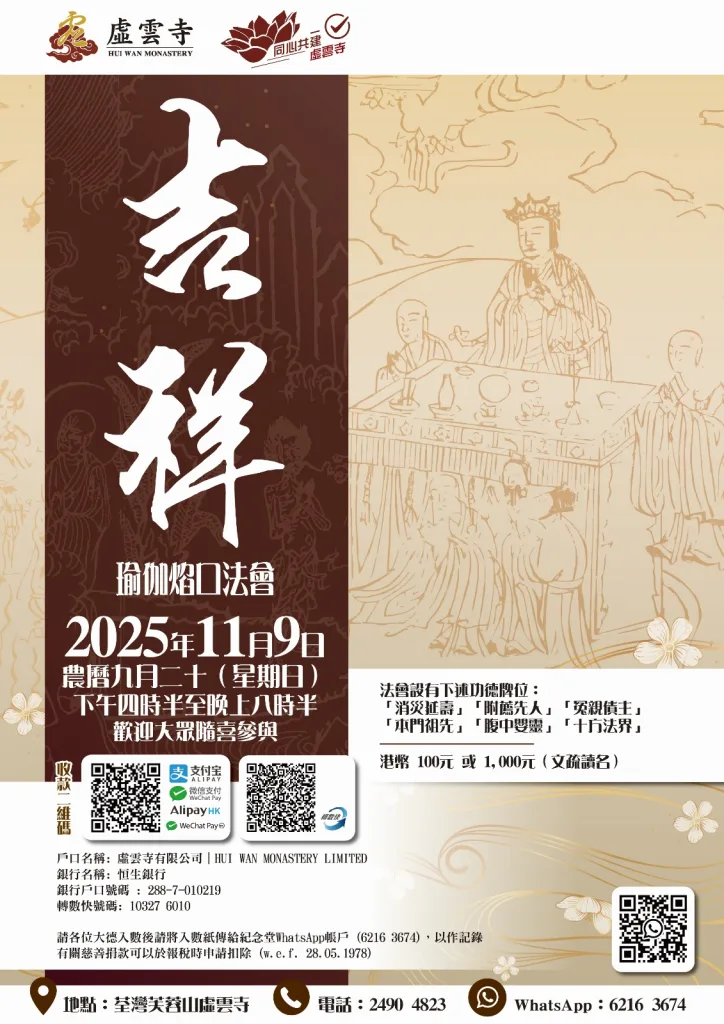 瑜伽焰口法會是佛教密宗以《佛說救拔焰口餓鬼陀羅尼經》為依據,為超渡六道眾生特別是餓鬼道眾生所舉辦的儀式,主要目的是施食、授戒、為其說法,令其解除飢渴、獲得正見、進而脫離苦趣。 法會透過主法的觀想、持誦和結印,加上參與法會者的清淨心,以達到自利利他的目的,而「瑜伽」則意指相應和相應三業(身、口、意)。透過參與法會,行者能淨化妄念,堅定菩提心願,於紛亂世間覓得清淨依歸。虛雲寺法會開放包容,不論您信仰深淺,皆歡迎前來共修。