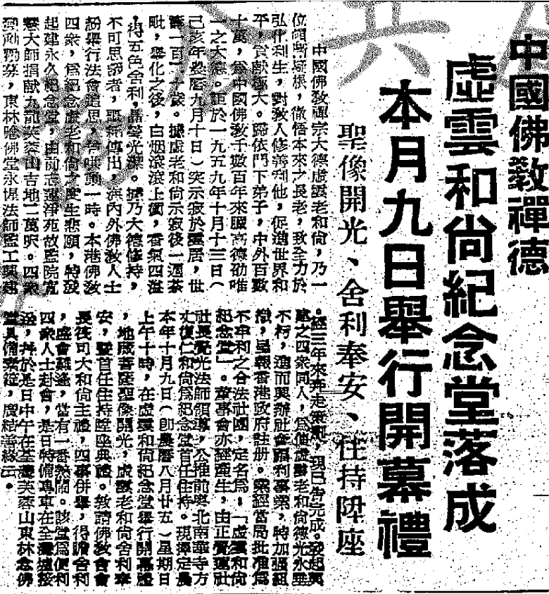 - 1963年:虛雲和尚紀念堂正式建立,由香港佛教人士發起,紀念虛雲老和尚的功德。